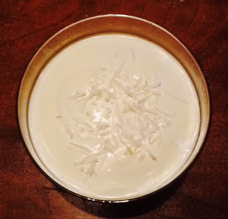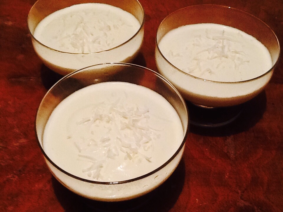 3. A few hours later, whip the reserved coconut cream (or fold it into whipped cream). Spoon as much of this over the chilled custards as you desire. Garnish with thread coconut and enjoy! 🙂